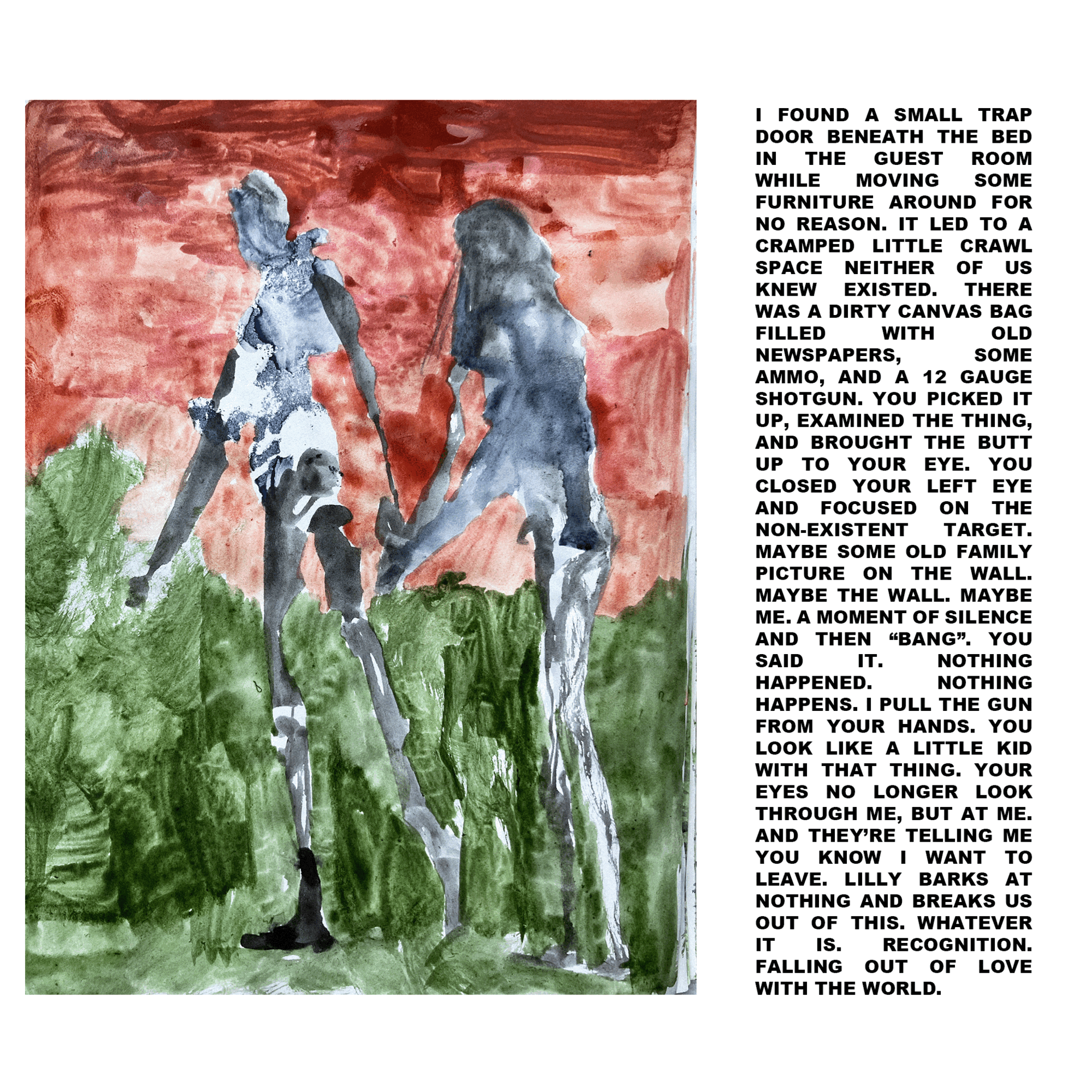I found a small trap door beneath the bed in the guest room while moving some furniture around for no reason. It led to a cramped little crawl space neither of us knew existed. There was a dirty canvas bag filled with old newspapers, some ammo, and a 12 gauge shotgun. You picked it up, examined the thing, and brought the butt up to your eye. You closed your left eye and focused on the non-existent target. Maybe some old family picture on the wall. Maybe the wall. Maybe me. A moment of silence and then “bang”. You said it. Nothing happened. Nothing happens. I pull the gun from your hands. You look like a little kid with that thing. Your eyes no longer look through me, but at me. And they’re telling me you know I want to leave. Lilly barks at nothing and breaks us out of this. Whatever it is. Recognition. Falling out of love with the world.